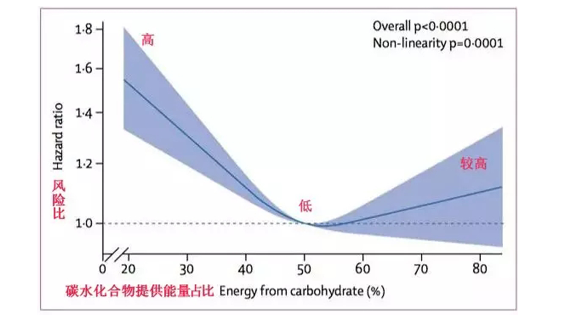 雖然桐山秀樹只是個例,但世界權威醫學期刊“柳葉刀”公共衛生刊曾發表一項研究:碳水化物攝入太多或太少都會減壽。結果發現兩者關系呈“U“字型曲線。
