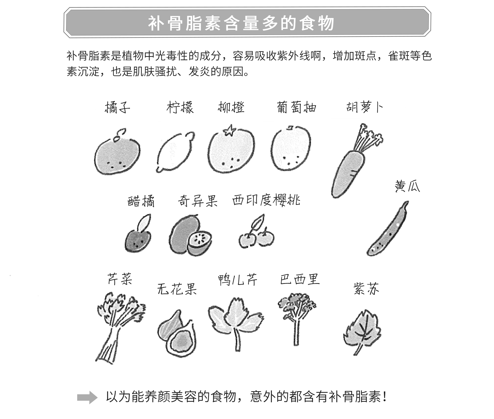 水果中的維生素及礦物質對皮膚有益,但是果糖卻會造成肌膚黯沉。柑橘類水果中的感光元素易使肌膚在曬后形成黑斑。