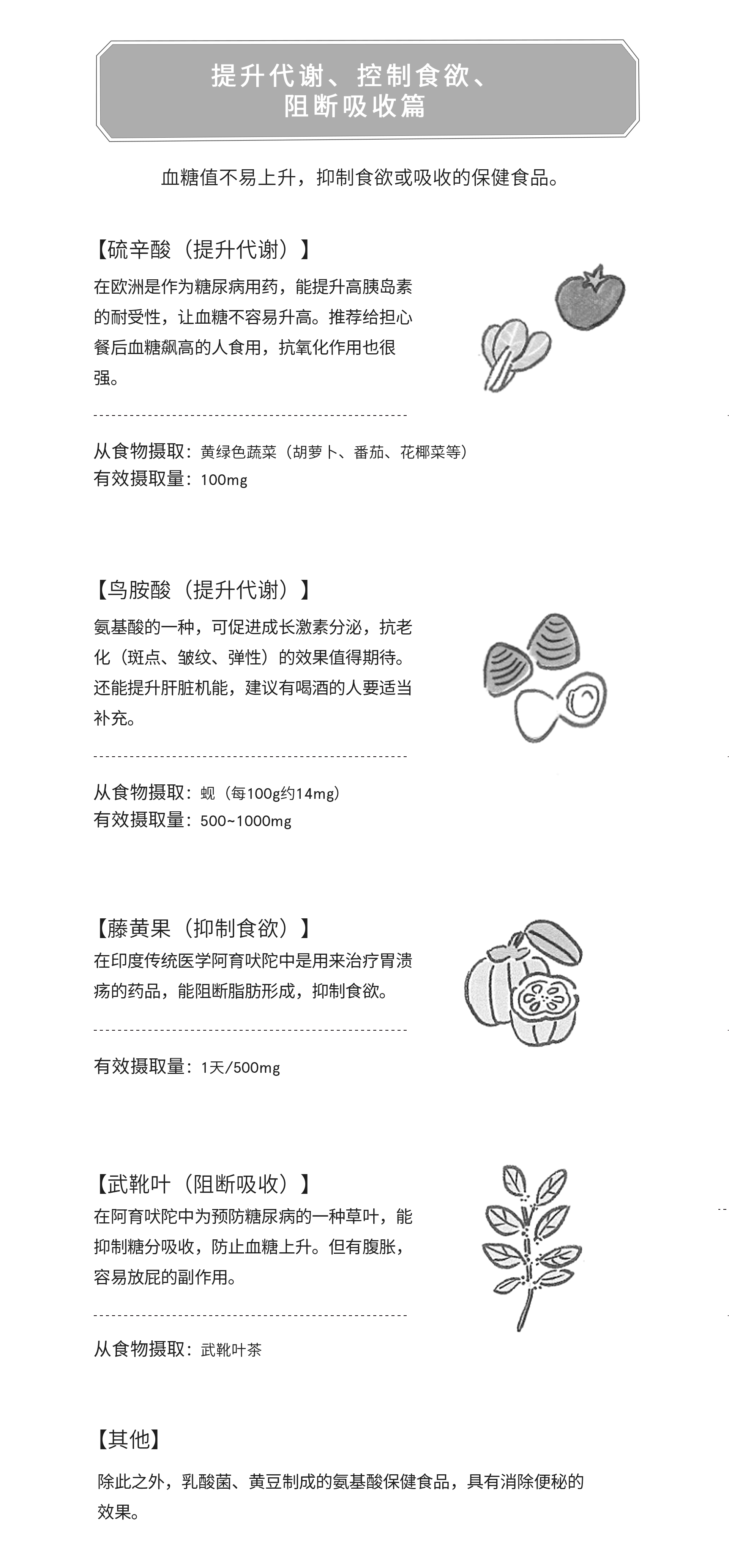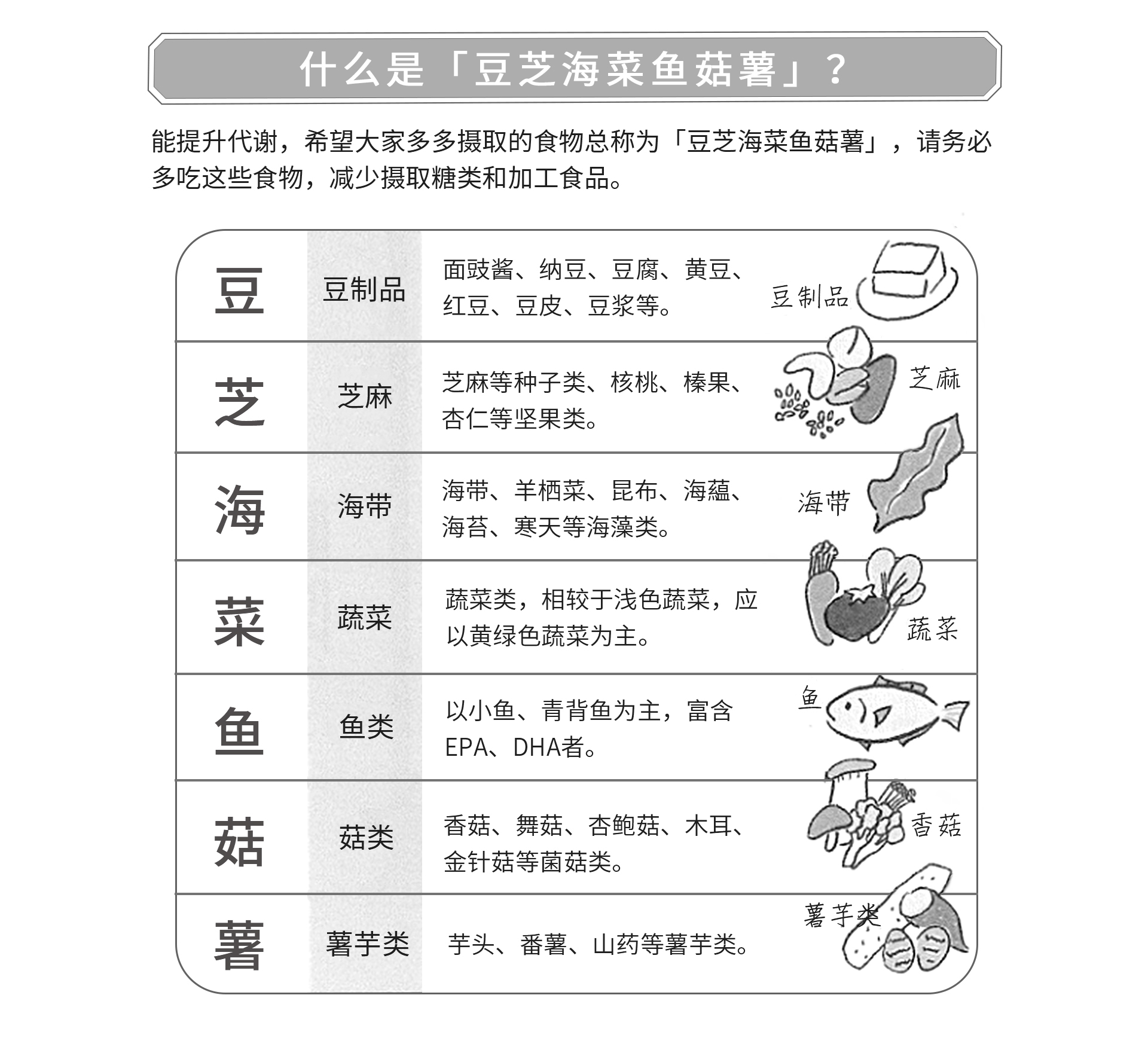 促進代謝營養素的優良食物【豆芝海菜魚菇薯】,還有營養豐富的:雞蛋、肝臟、發酵黃豆、鯖魚、杏仁、酪梨、起司等。